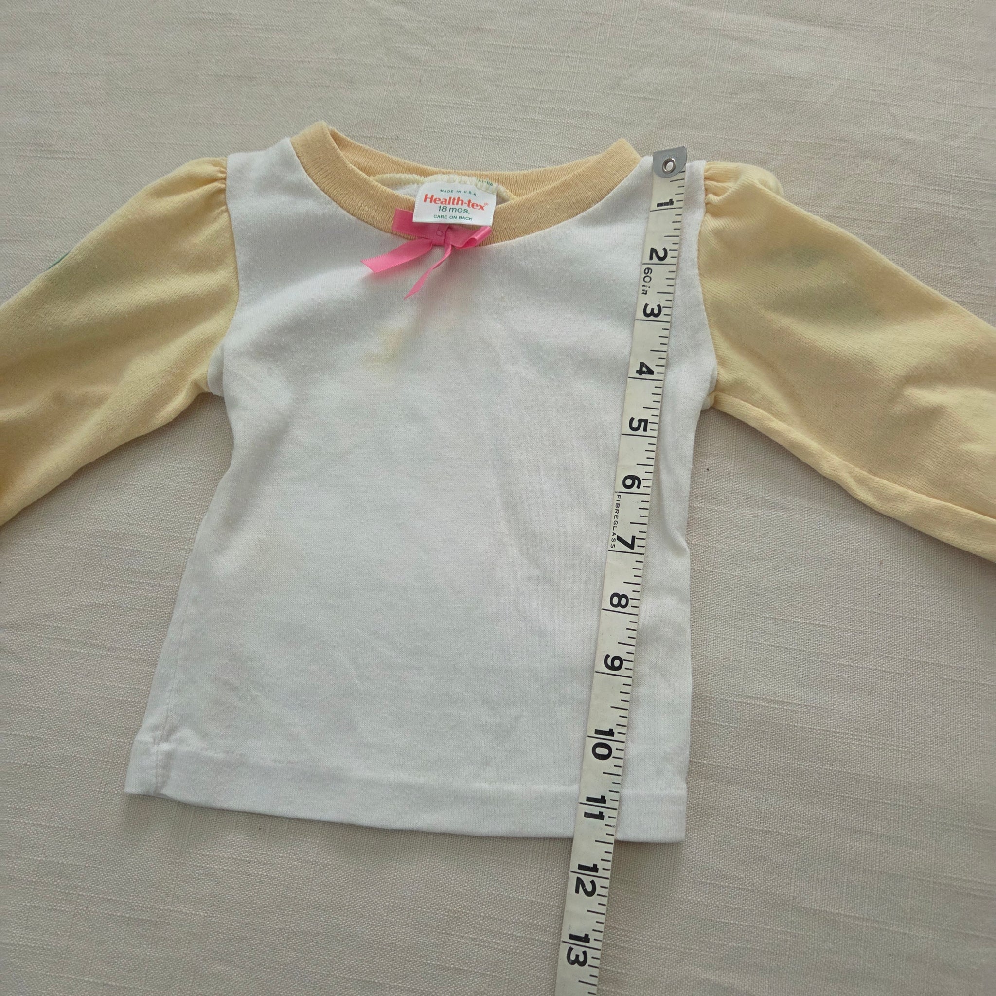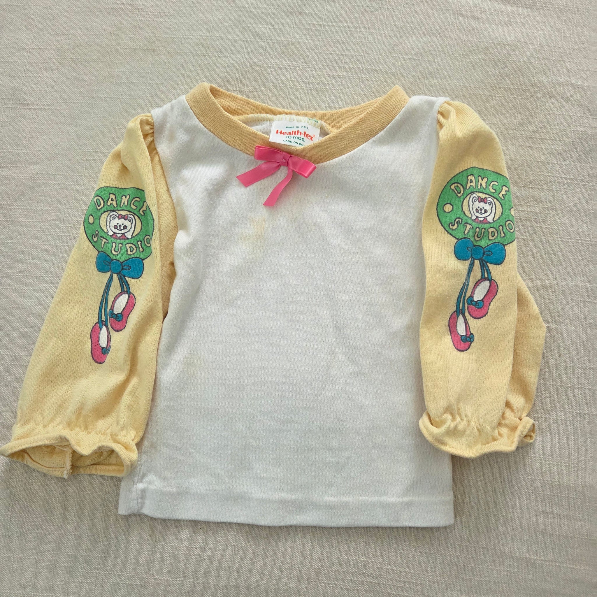 Vintage Healthtex brand yellow and white long sleeve shirt with bears and ballet "dance studio" details on sleeves! Note a spot on chest shown and elastic is relaxed in wrists. Please see all photos for condition and measurements
