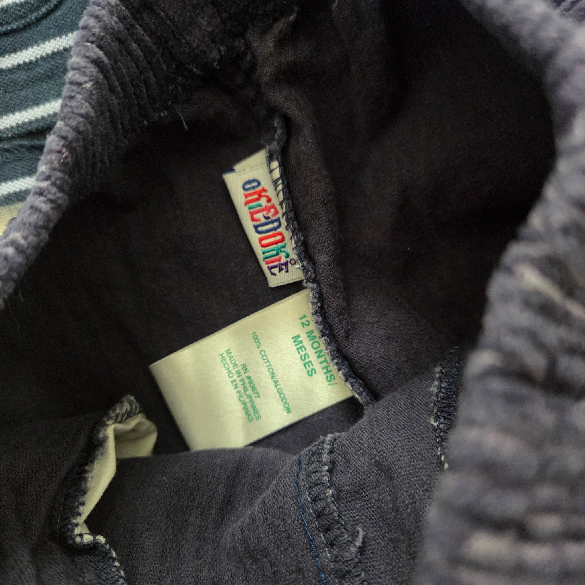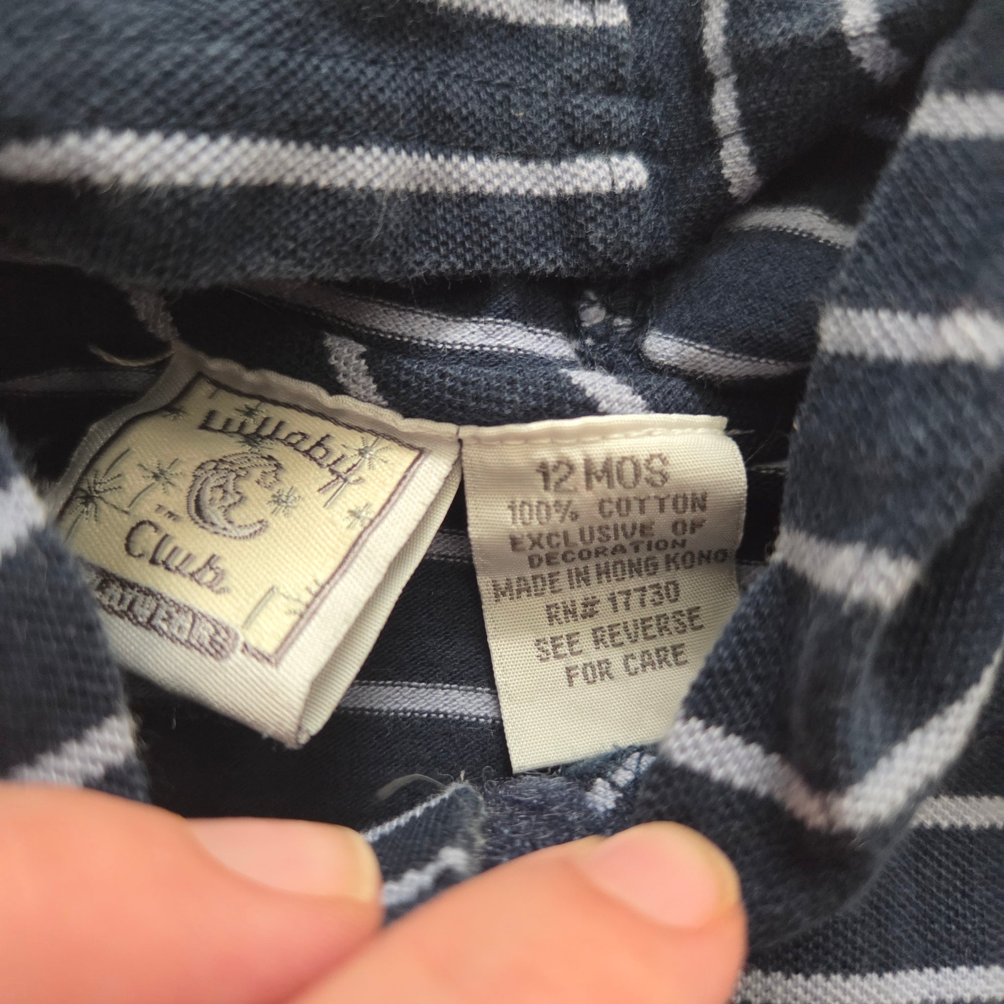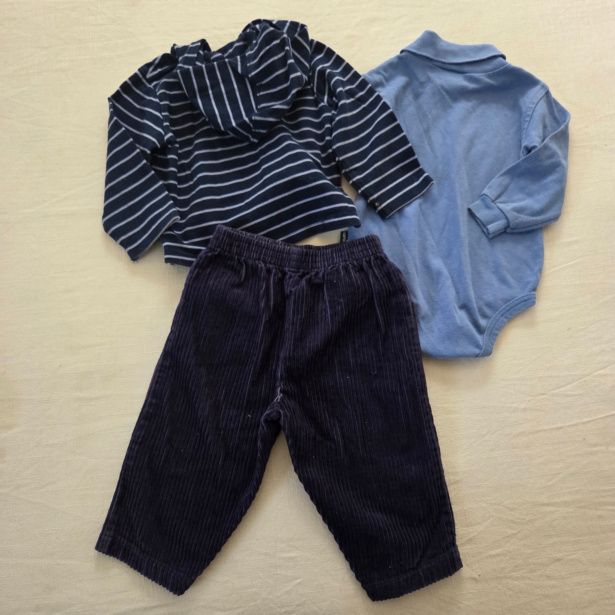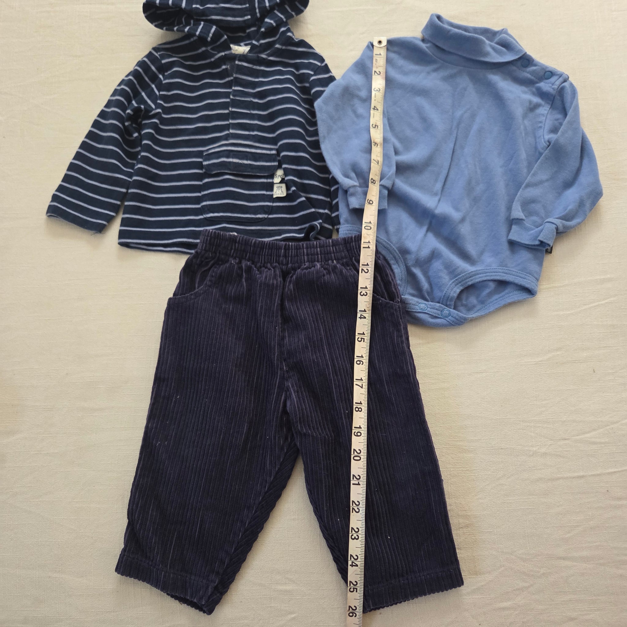 Vintage 3-piece bundle of navy blue hooded striped shirt, blue turtleneck romper, and navy blue corduroy pants with stretchy elastic waist! Please see all photos for condition and measurements